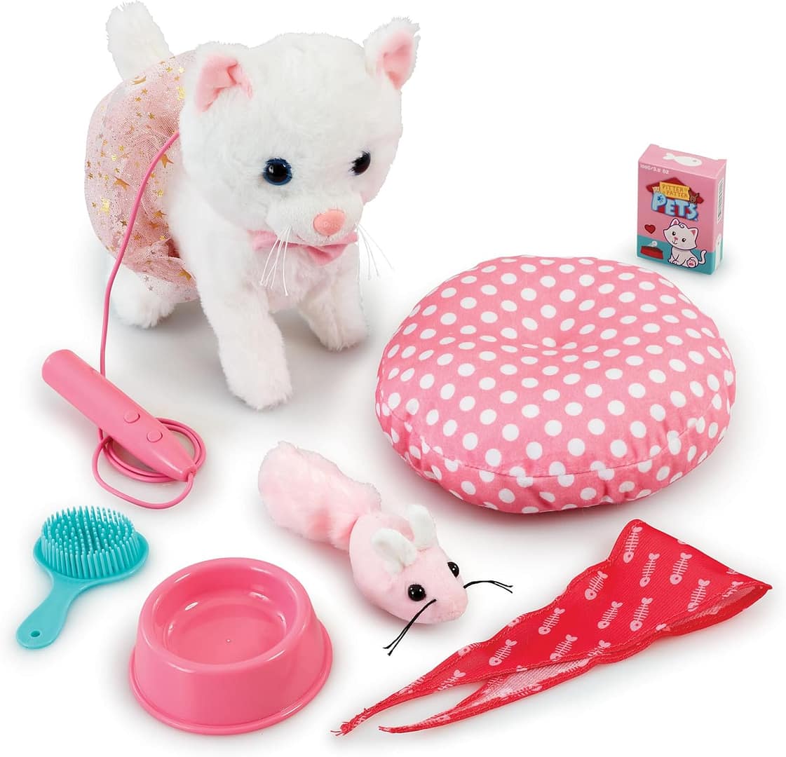 - Includes: 1x Walk Along Cat Deluxe, 1x bowl, 1x mouse toy, 1x grooming brush, 1x tutu, 1x neckerchief, 1x treat box and 1x pillow