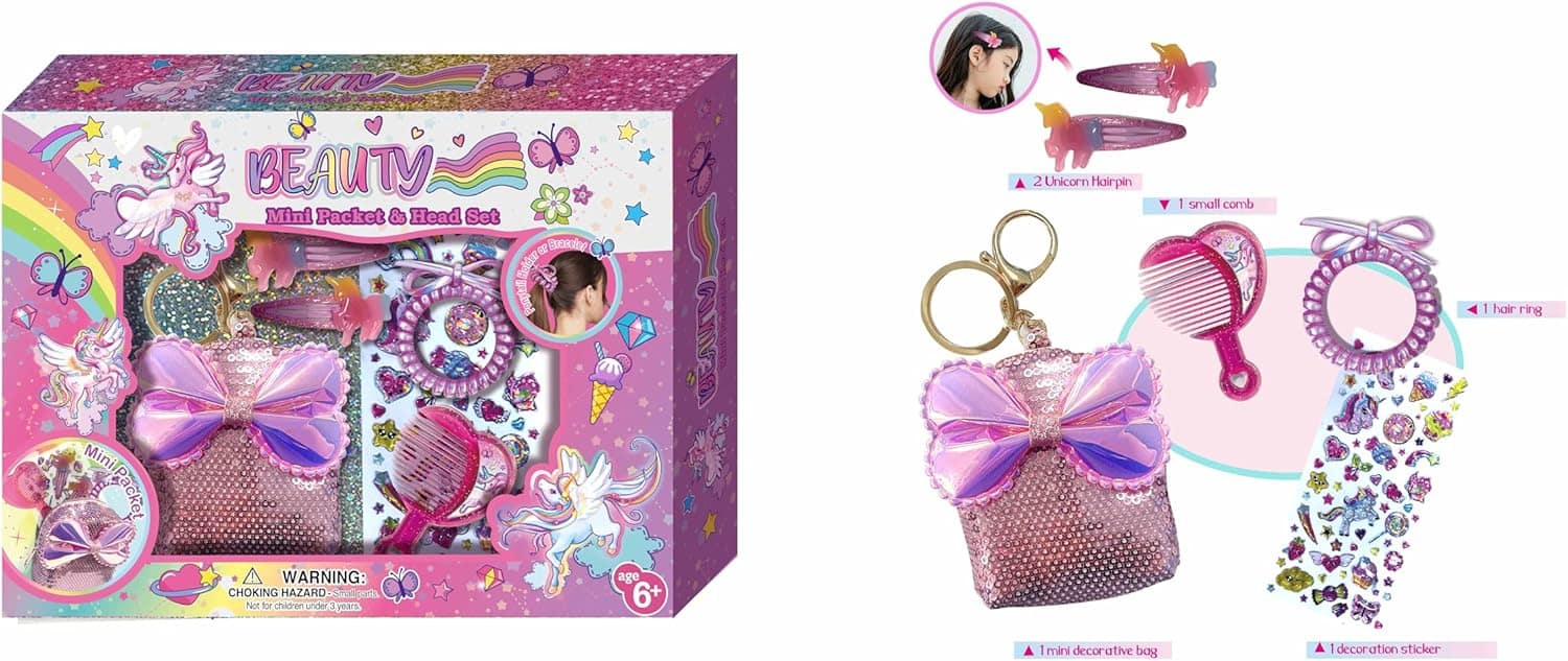 Pecoware Beauty Mini Packet and Head Set is a delightful ensemble designed for your little one’s enjoyment. Inside, you’ll find a sequin bag with a versatile bow that can double as a chain, along with keys, two adorable unicorn hairpins, a comb, a hair elastic and a sticker sheet for added fun. This special bag not only keeps belongings safe but also makes for a stylish accessory to take anywhere. With box dimensions measuring 29 cm x 22 cm x 5.5 cm, it’s perfectly sized for young hands to handle. Suitable for ages 3 and over, this set is sure to bring joy and excitement to any girl’s day.