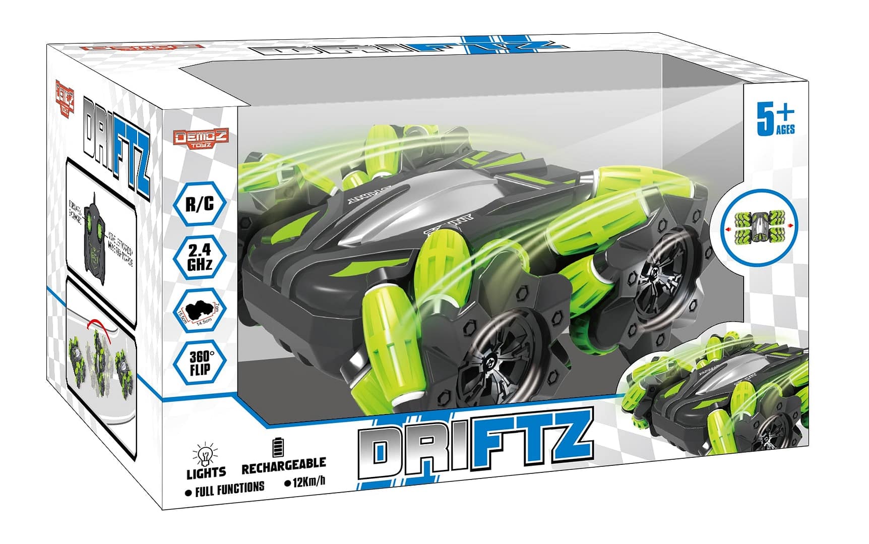 Demoz R/C Driftz 2.4GHz – full function remote controlled stunt car. 360 degree rotation drift stunt. Ready to run with maximum speed 12km/h, lithium rechargeable battery pack with USB charger. Made of certified strong ABS material, non-toxic, safe, durable, smooth surface without burrs. Enjoy endless indoor & outdoor stunt fun.