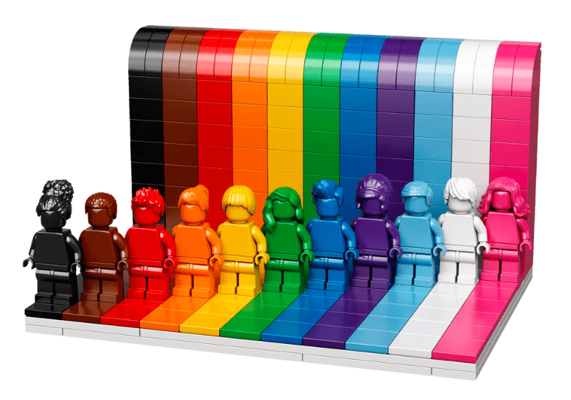 Colorful Celebration of Inclusivity: Features 11 monochrome minifigures, each in a unique color with a matching hairstyle, standing proudly in front of a vibrant rainbow backdrop.
