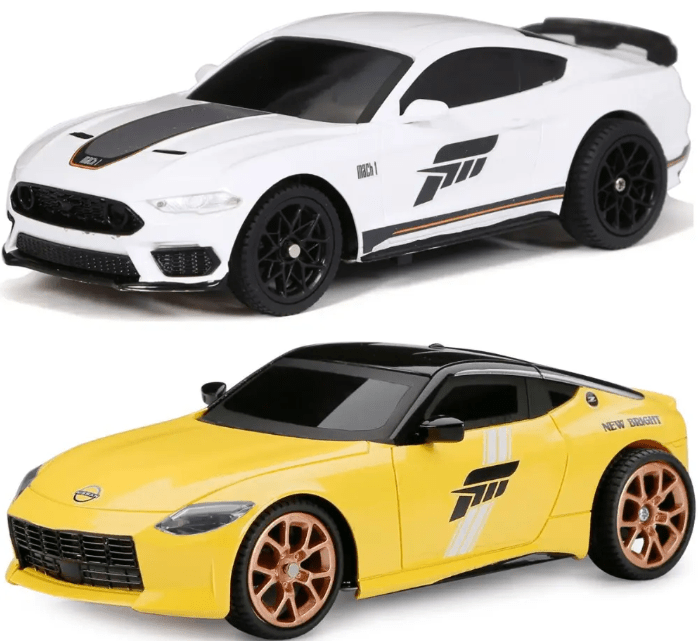 New Bright 1:24 Scale RC Forza Motorsport Bugatti, Mustang and Nissan Z with 2 speed turbo is a detailed model inspired by the cars from the Forza Motorsport video game series created by Microsoft! Scaled down to a version that fits in your backpack, you control the action with full function radio control. Forward/Reverse drive and Left/Right Steering. A great purchase for indoors or outdoors. This Forza Motorsport sportscar can operate in a range up to 80 feet. You will rule the track and be able to bring home all the action on screen to life!