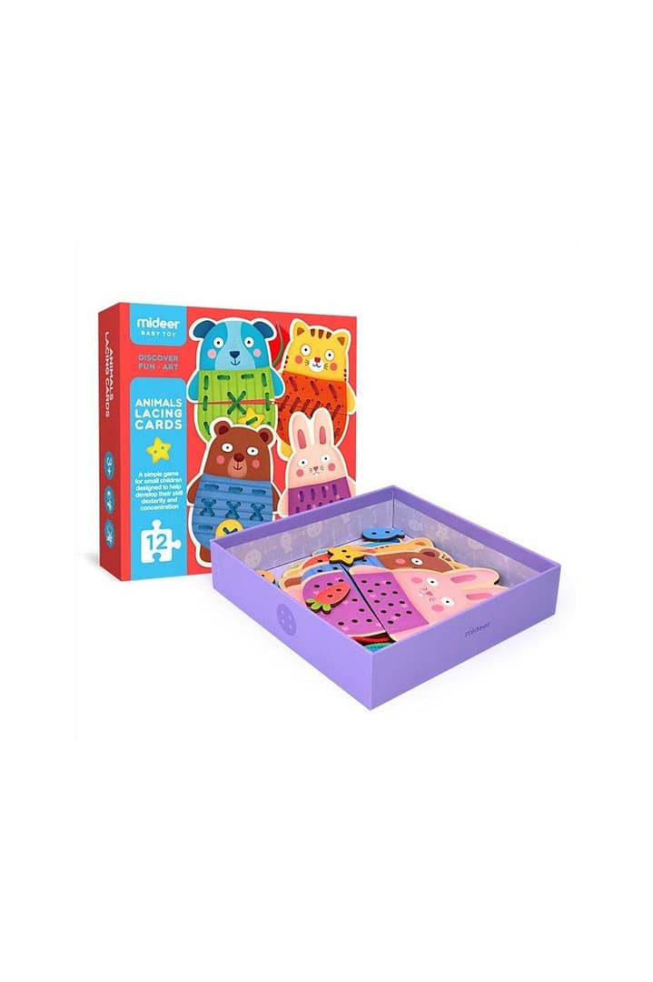 Mideer Animal Threading Game is designed to develop small muscles in a child’s hand. There are 4 unique animals made from wood. Threading the laces through holes requires mindfulness and steady hands, developing children’s carefulness, patience, and observation. Lace-up however you like, skipping, following order, spacing, or crossing. The cards are made of high-quality wood. There are multiple options to lace the animals with different thread colors and accessories. They can match the animals with the color-coded bottoms or make up fun combinations. Each animal is made up of three parts. Top, bottom, and accessory. By looking for the corresponding accessories, or by mixing up the accessories children can stimulate their imaginations while having hours of fun.